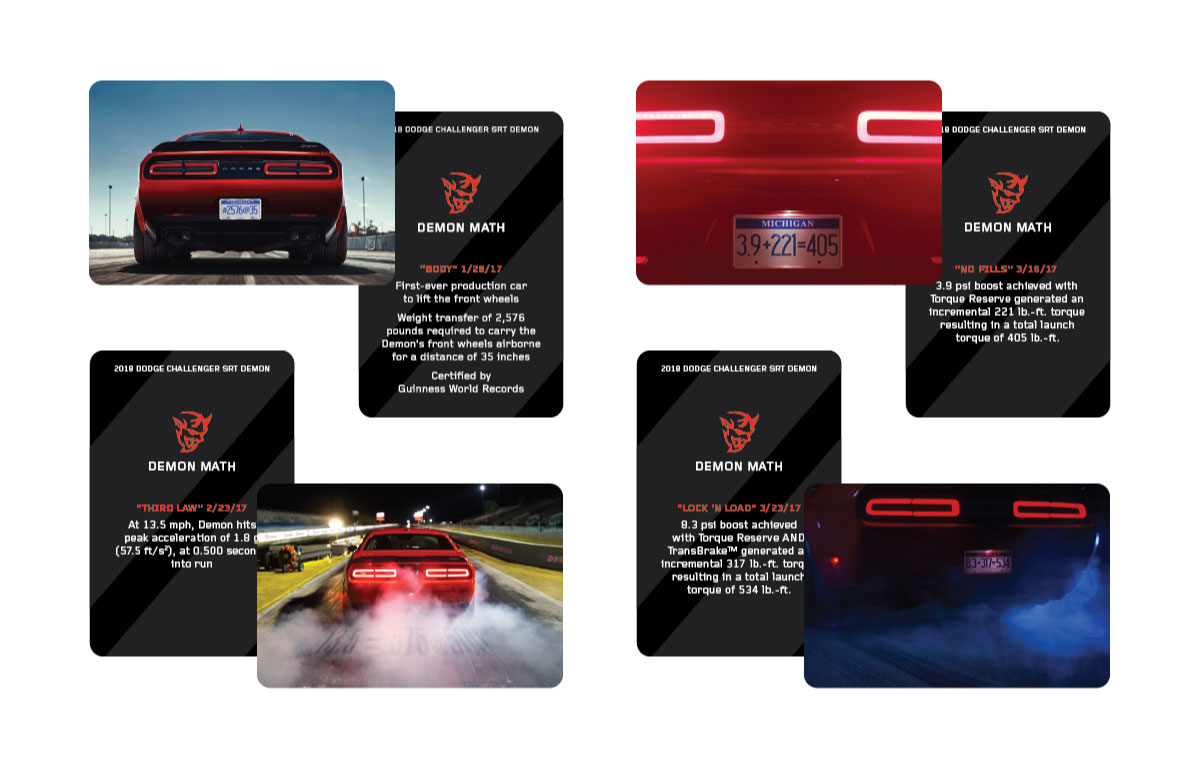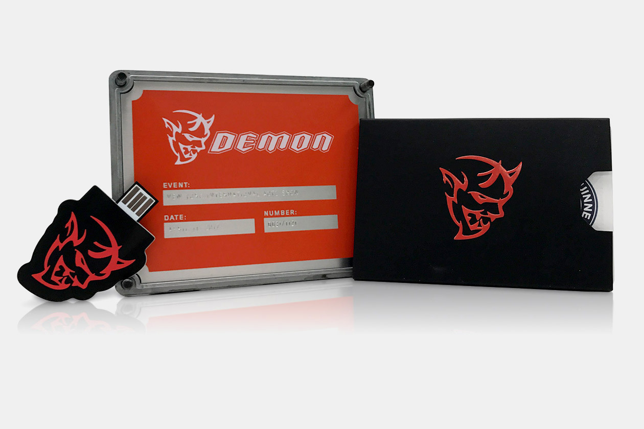 We designed and produced an information kit that became an instant collector’s item. The outer package was a custom aluminum box with a cast replica of the “demon head” protruding from atop the actual car’s supercharger. Four guide bolts connected the lid to the box bottom, and a numbered identification plate (sequence 0001 to 1121) was affixed to the inside of the lid. Inside was an embossed envelope containing a series of cards highlighting key facts, features and world records related to the vehicle, as well as a branded “web key,” which provided immediate connection to an interactive website we developed.
