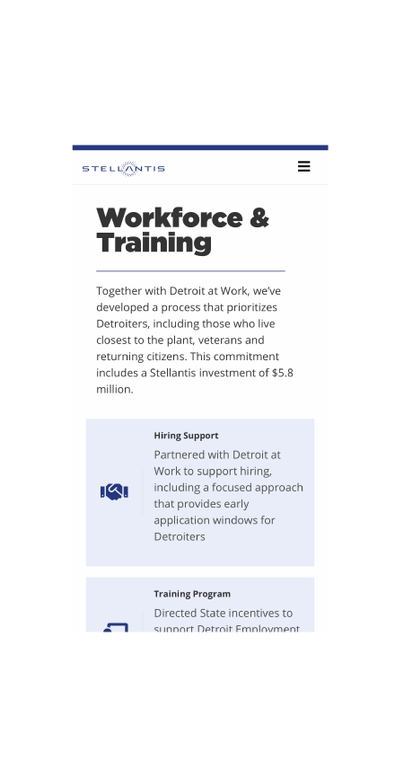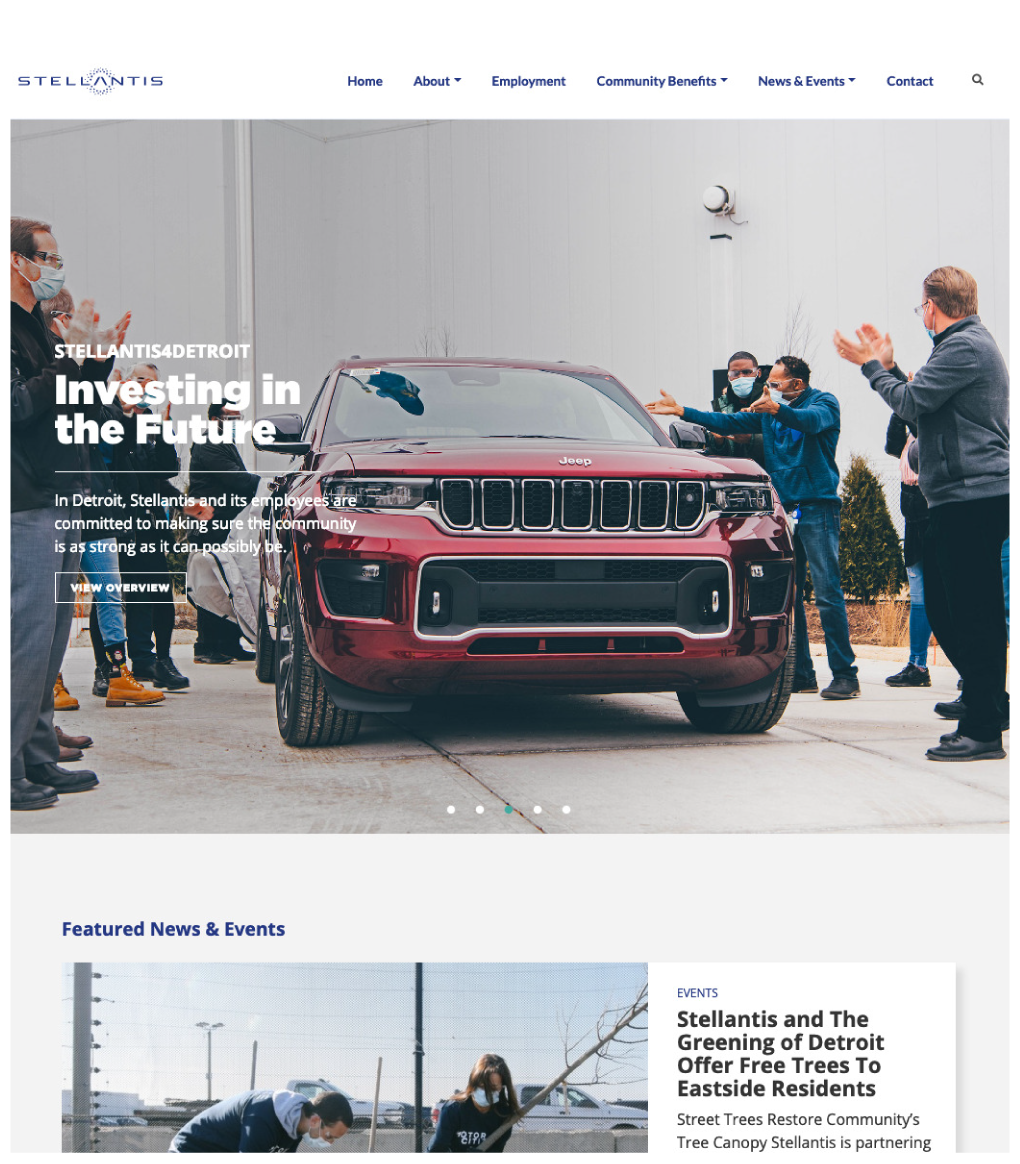 Stellantis (formerly FCA) invested over $2.5 billion in a new Detroit Assembly Complex, the first new automobile assembly plant in the city of Detroit in three decades. To best provide ongoing, current information about the complex, its people, products, the community and company to area residents – as well as other interested parties – we were asked to design and develop a website to be used as a primary communications source.